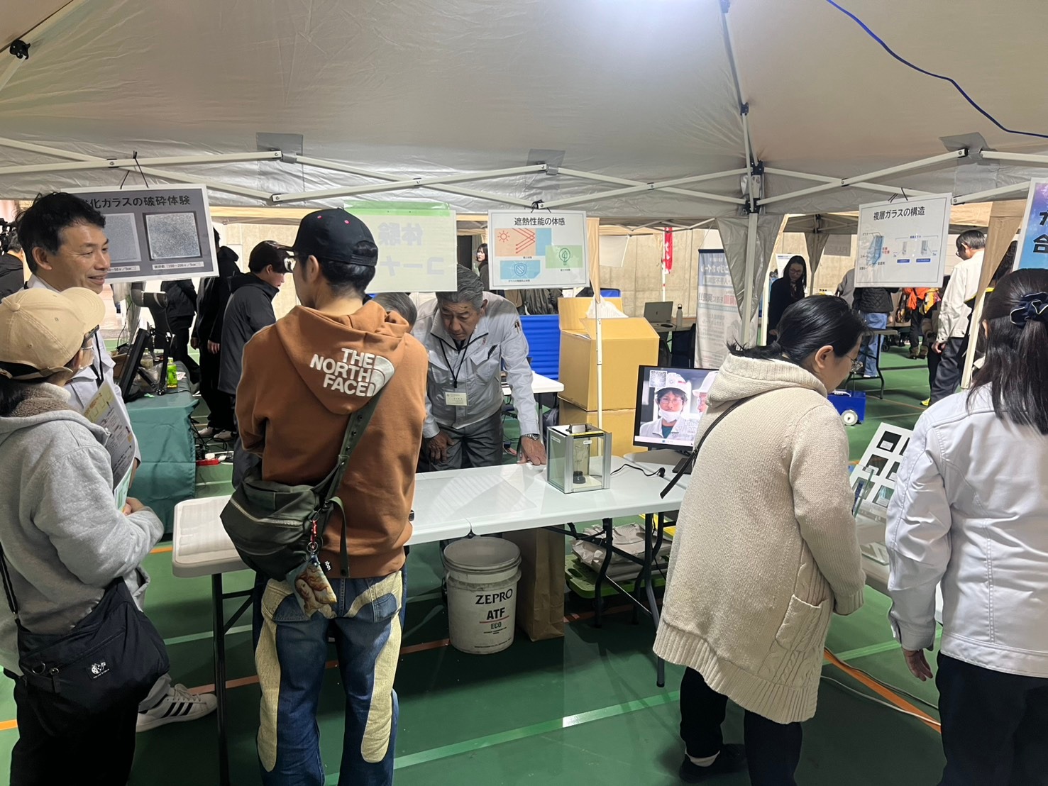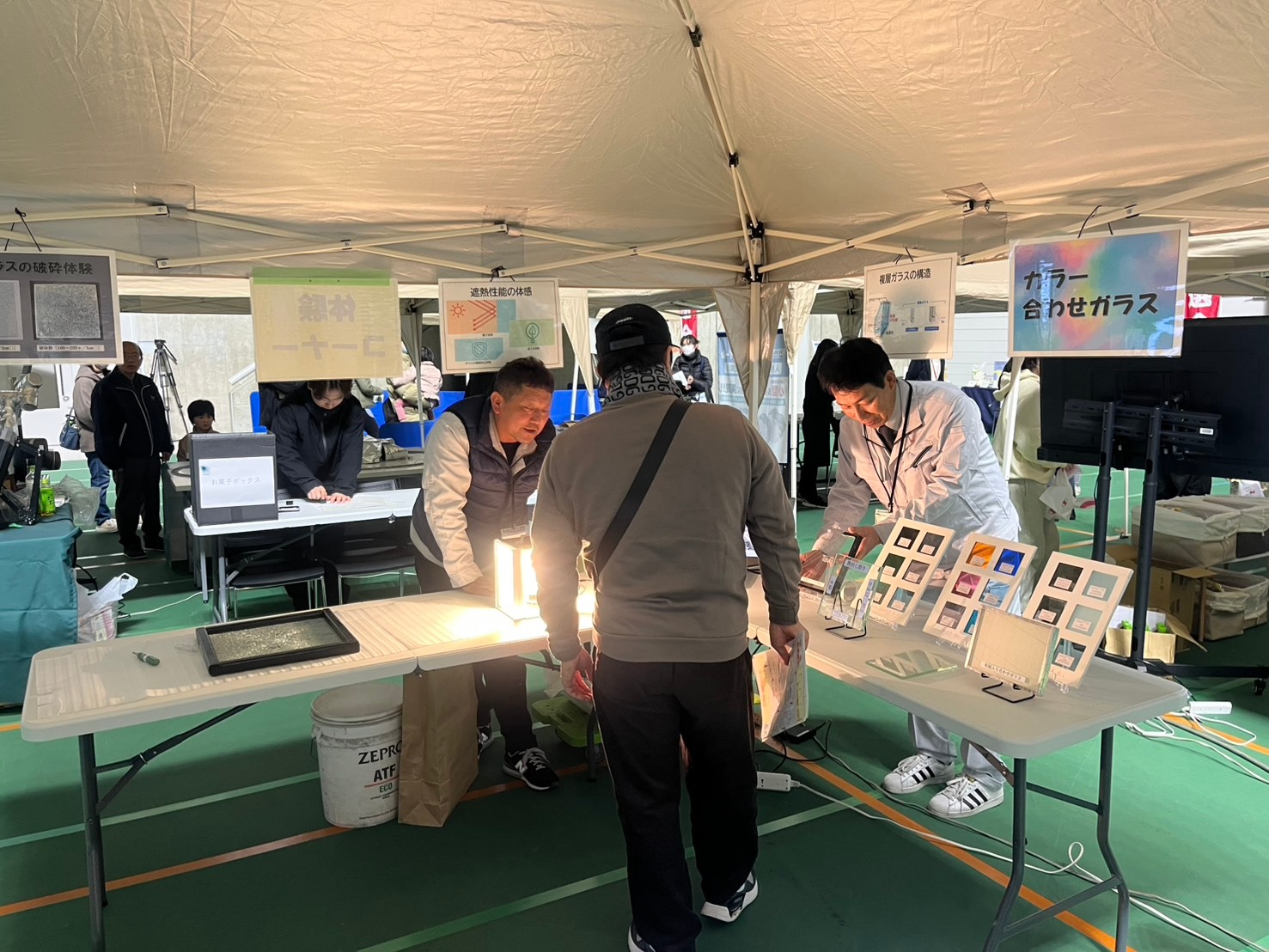 強化ガラスの破砕試験の体験コーナーは非常に好評でした!